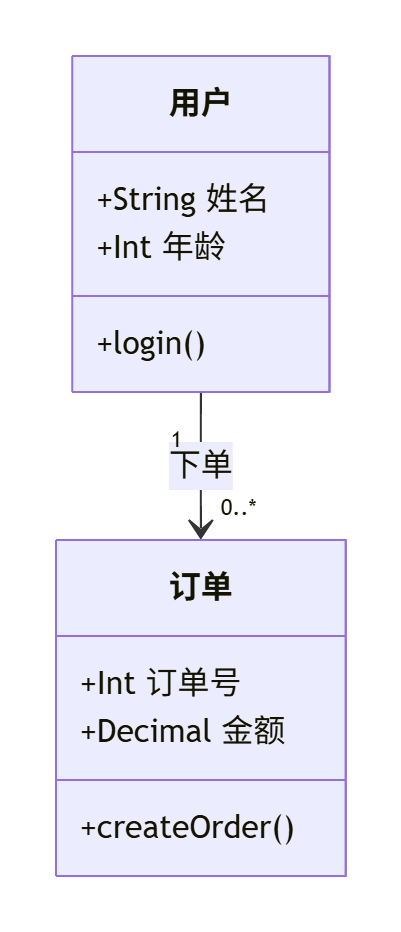 | classDiagram class 用户 { +String 姓名 +Int 年龄 +login() } class 订单 { +Int 订单号 +Decimal 金额 +createOrder() } 用户 "1" --> "0..*" 订单 : 下单