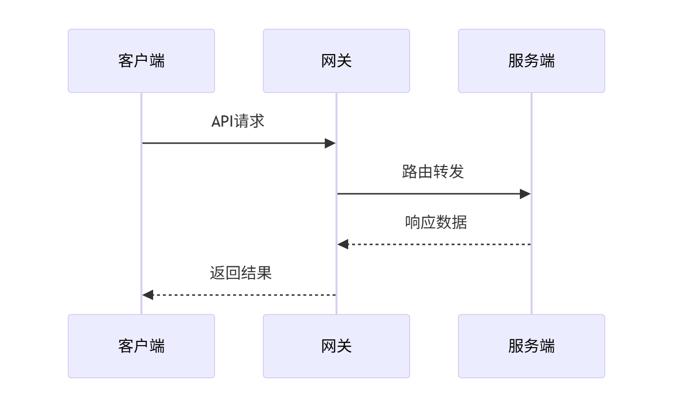 | sequenceDiagram participant 客户端 participant 网关 participant 服务端 客户端->>网关: API请求 网关->>服务端: 路由转发 服务端-->>网关: 响应数据 网关-->>客户端: 返回结果