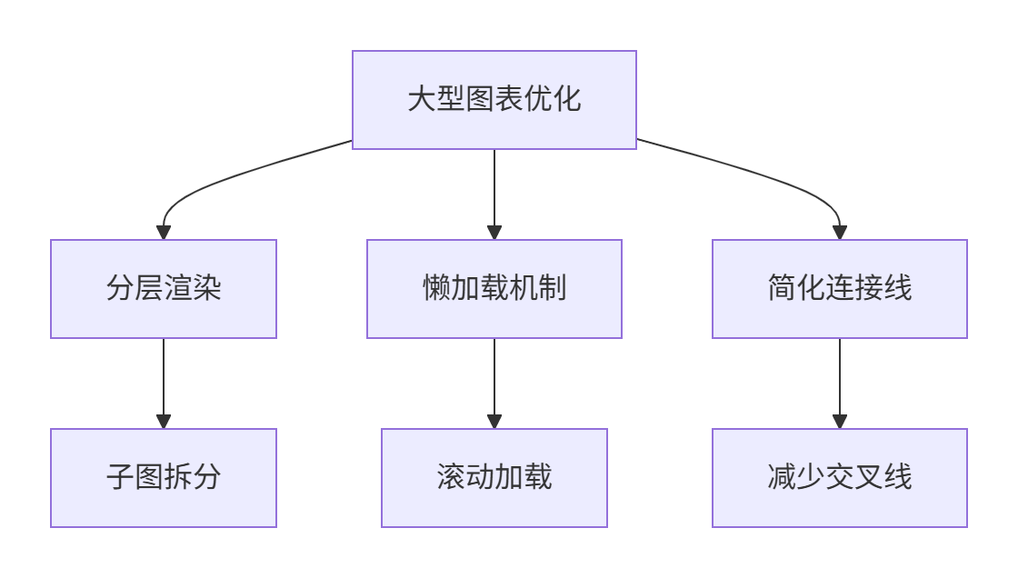 | graph TD A[大型图表优化] --> B[分层渲染] A --> C[懒加载机制] A --> D[简化连接线] B --> E[子图拆分] C --> F[滚动加载] D --> G[减少交叉线]