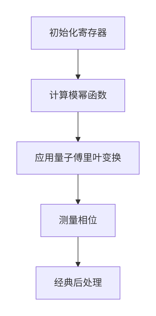 Shor算法的核心在于将质因数分解问题转化为周期查找问题,利用量子计算的并行性高效求解周期: